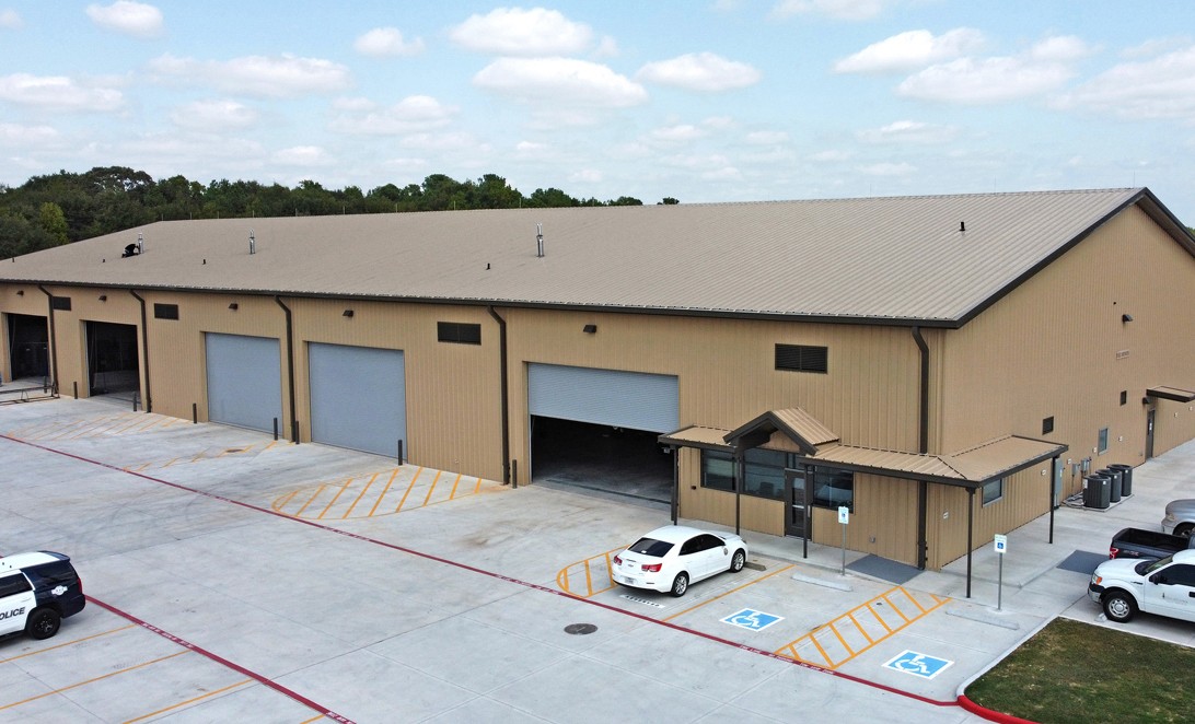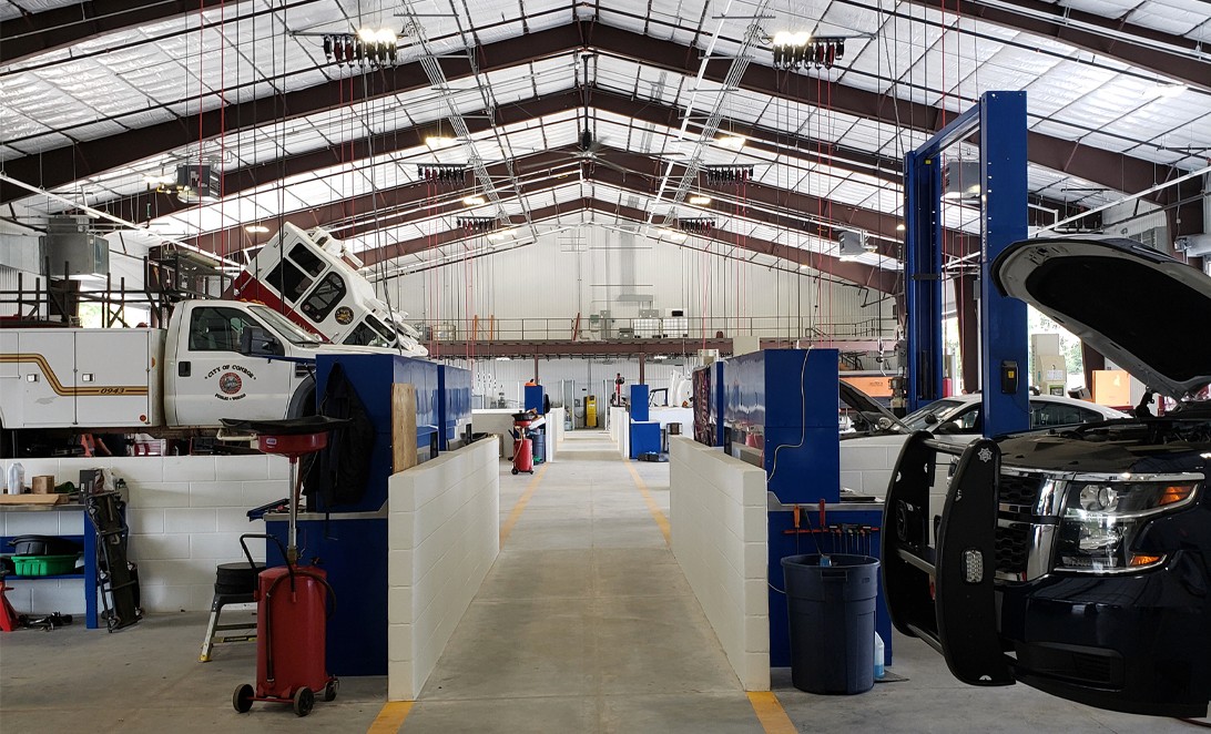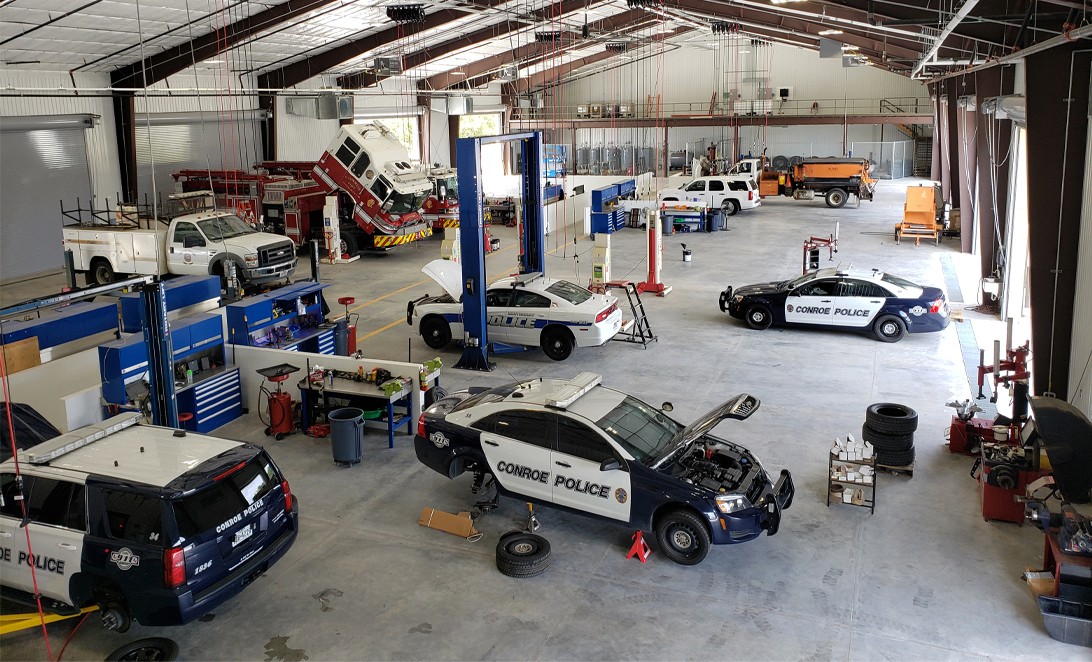 The City of Conroe Fleet Maintenance facility houses offices and vehicle maintenance bays, featuring a pre-engineered design that eliminates interior columns. It includes essential support spaces such as storage, restrooms, and a break area, serving the Conroe community effectively.