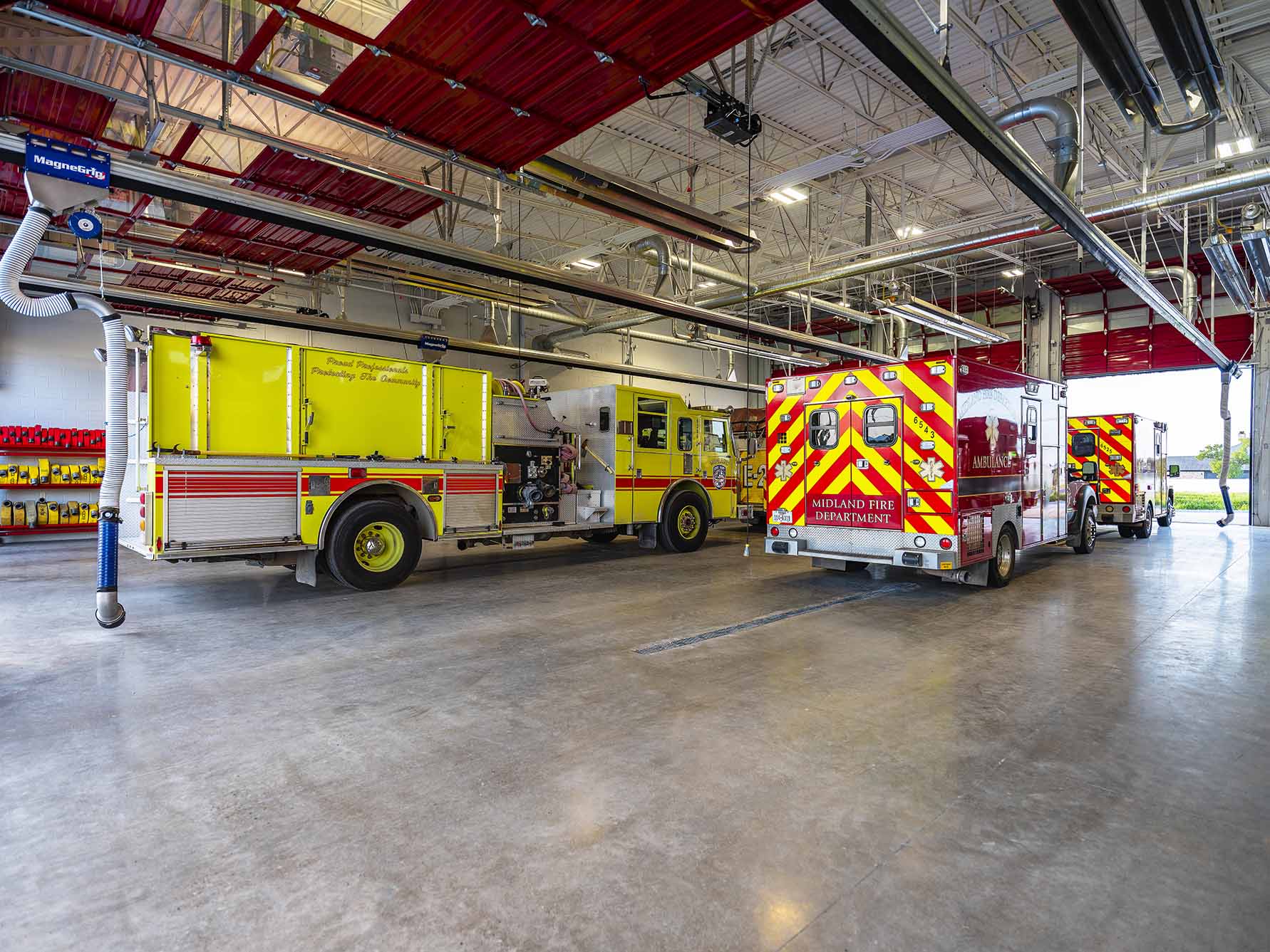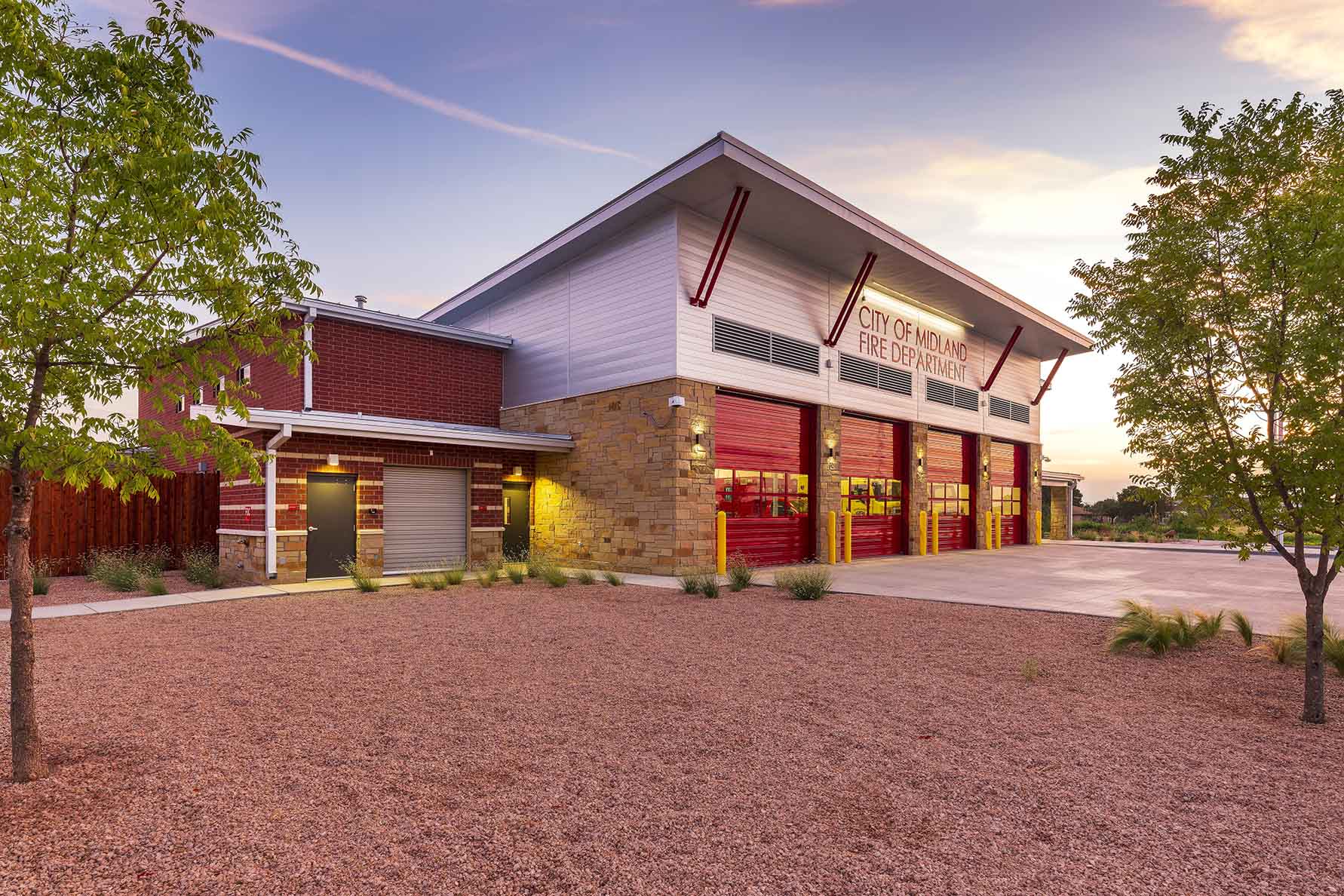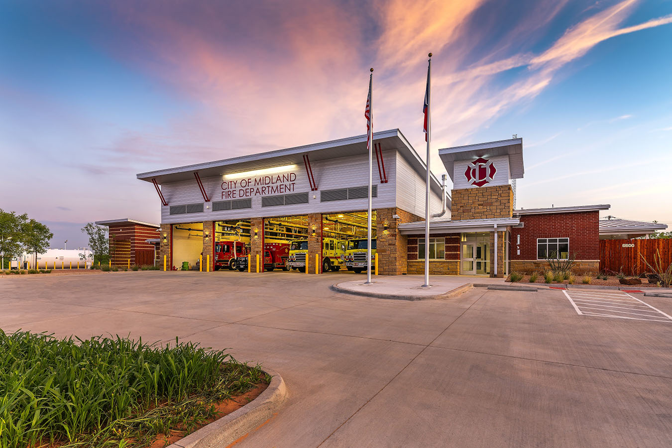Midland Fire Station 11 features a unique design with sloping roofs, durable masonry, and a minimalist aesthetic. It includes specialized areas for vehicle washing, living quarters with natural light, and an open living area for community interaction, all while prioritizing low-maintenance landscaping and advanced exhaust removal systems for fire apparatus.