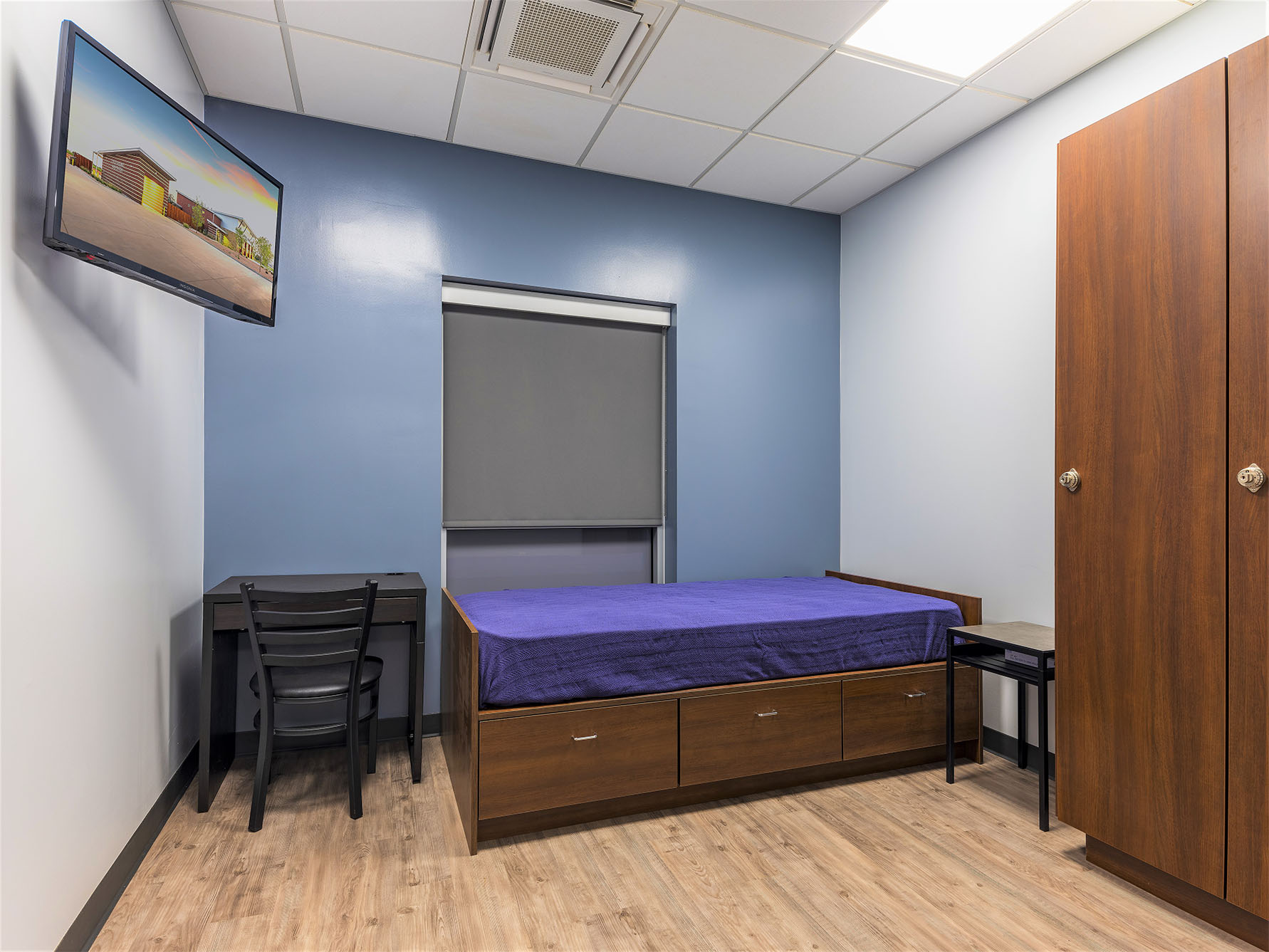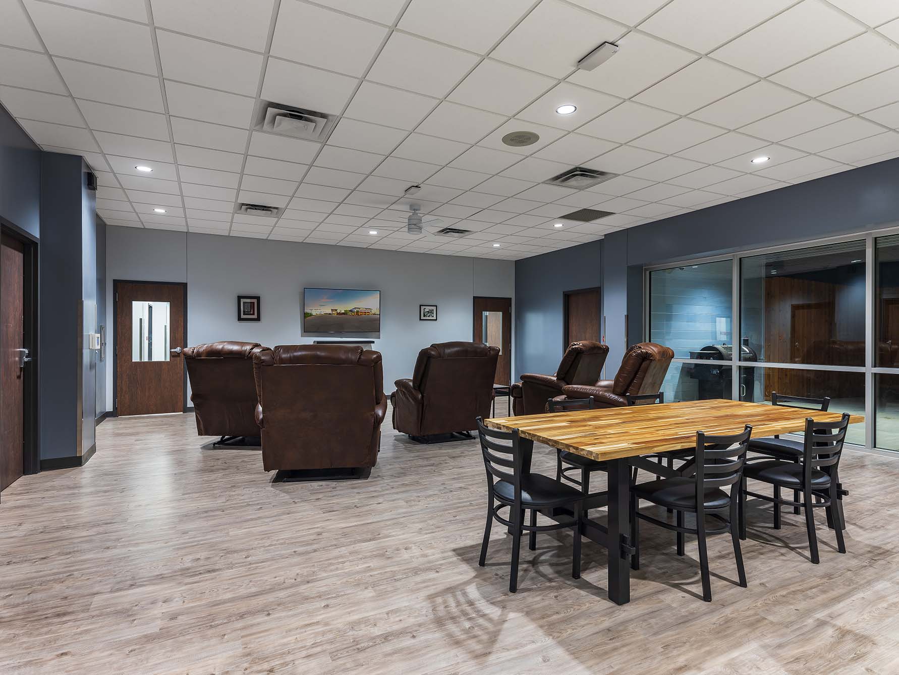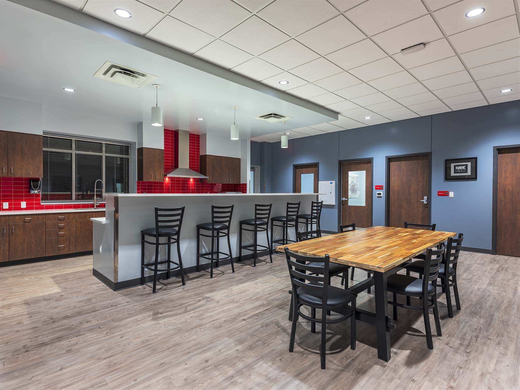 Station 11, strategically located in a future development area, features a distinctive design with alternating sloping roofs that highlight the fire service and create a prominent entryway. The building utilizes durable masonry for low maintenance and metal wall panels for visual contrast. A wash bay for city vehicles is integrated into the design, ensuring functional aesthetics. The landscape is designed for low maintenance and water conservation, with minimal grass areas for heat reduction and recreational use. The station includes an effective source-capture exhaust removal system in the apparatus bays and thoughtfully designed dorm areas that provide natural light and privacy. An open-concept living area encourages interaction among shifts, while an oversized gear room accommodates essential equipment effectively.