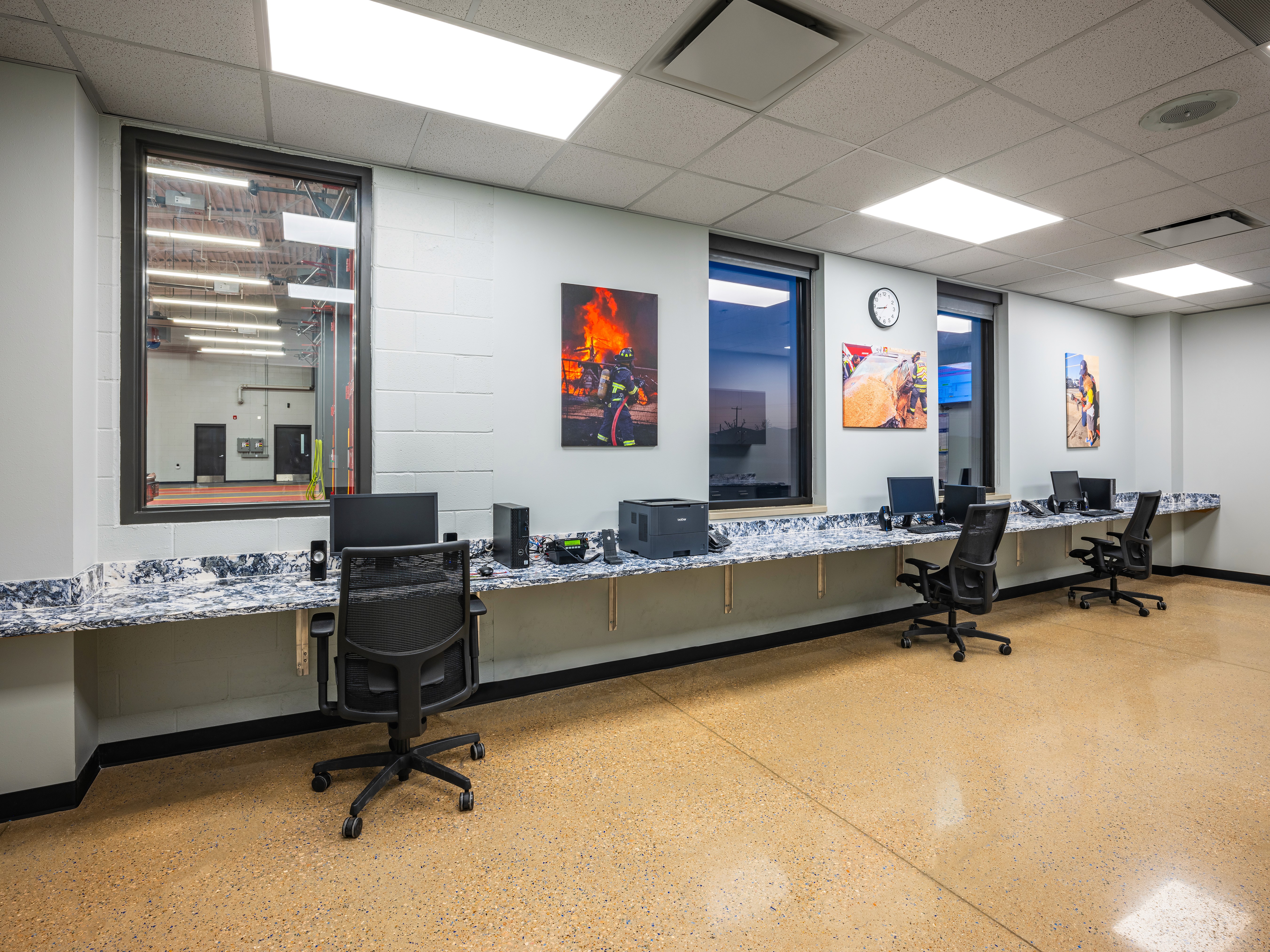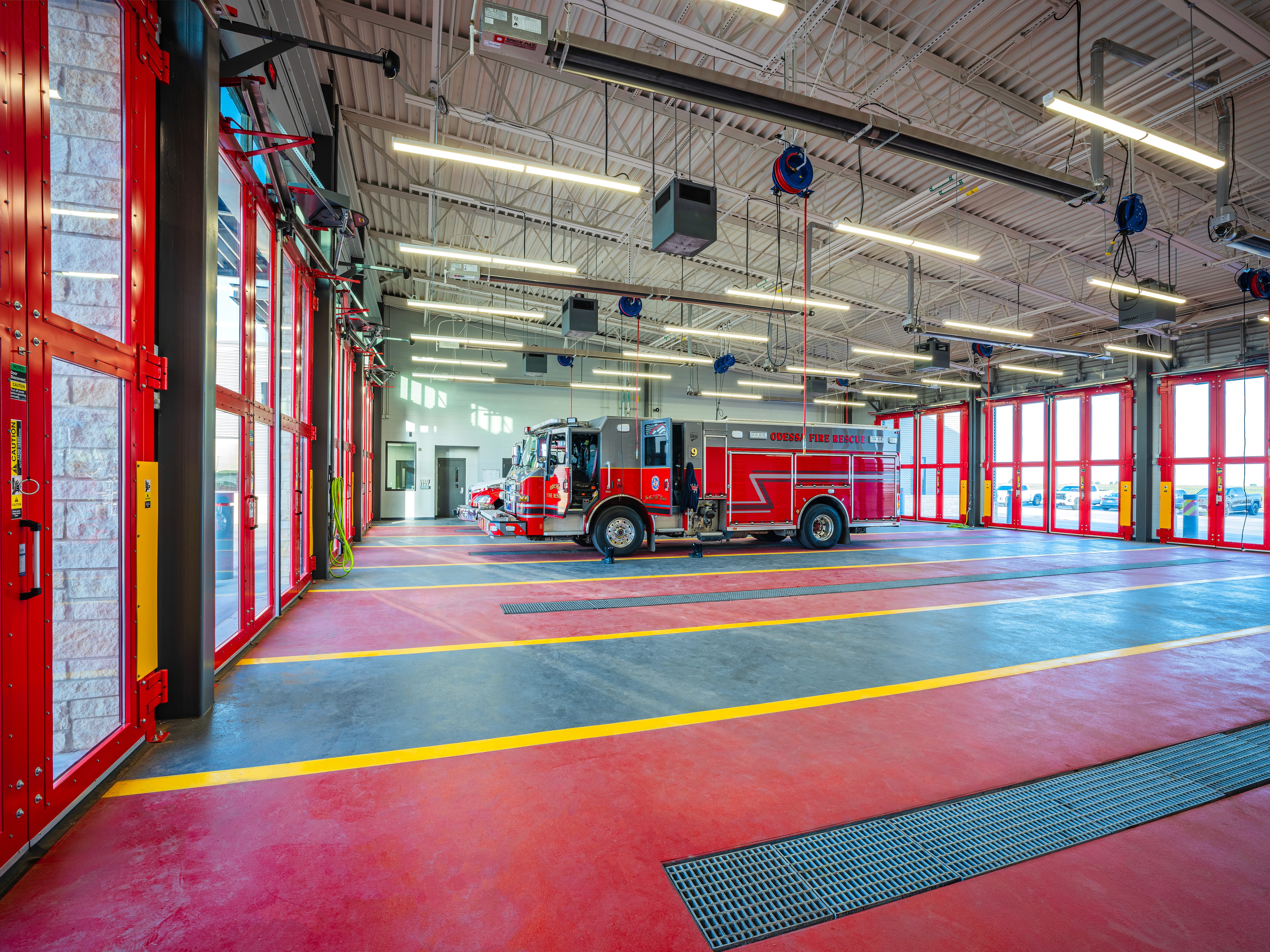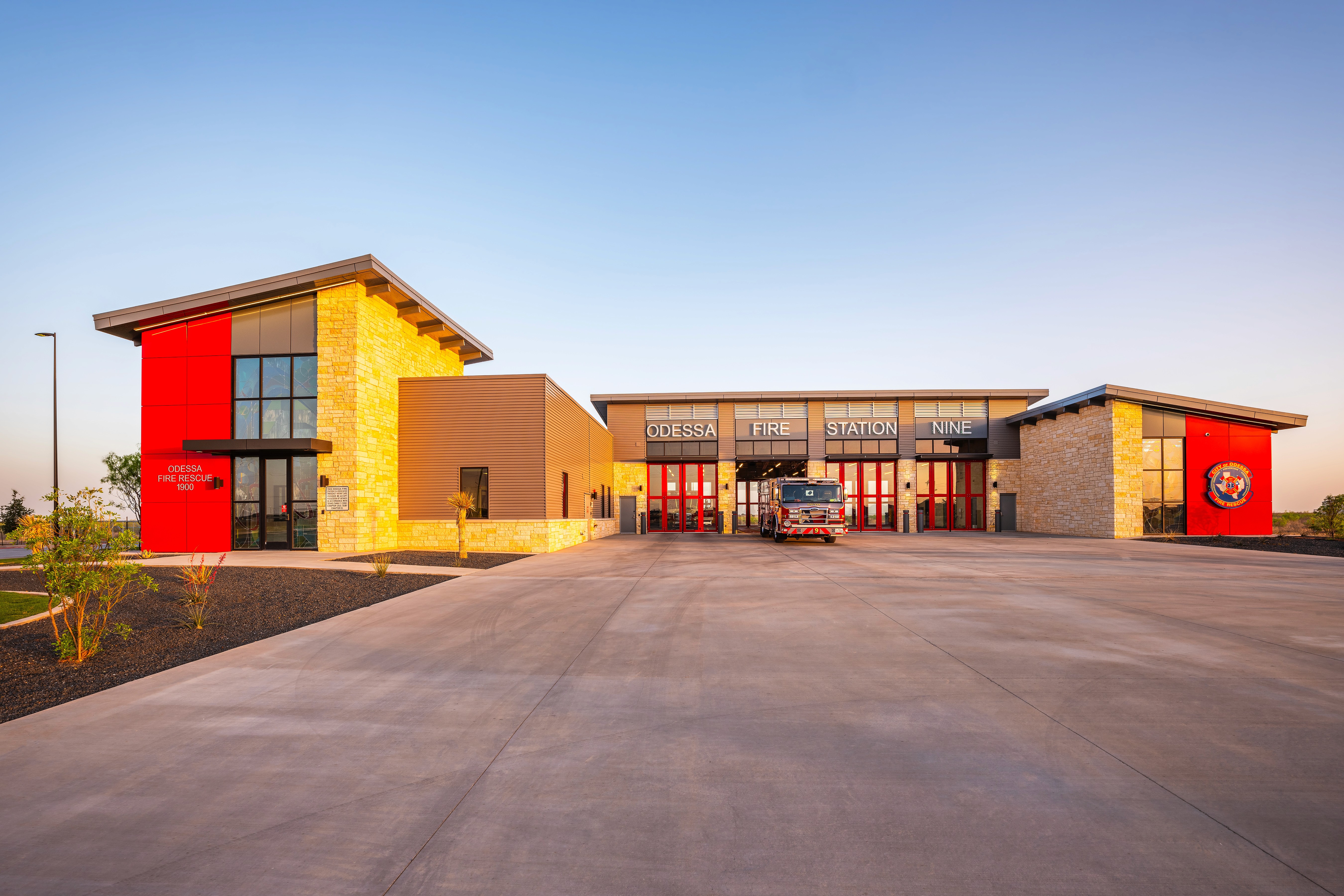 Station 9, designed alongside Station 6, features a unique interior while reflecting a strong exterior character with natural stone and metal panels. The design incorporates large windows at entry points to create a welcoming atmosphere. A focus on community pride is evident through stained glass applications from the city’s art program. The layout promotes efficient emergency response, with individual sleeping rooms and strategically placed gender-neutral restrooms. Common areas, including the day room and kitchen, utilize an open-concept design with vibrant finishes. A mezzanine space houses a fitness room, isolated for noise control. The garage includes a state-of-the-art exhaust removal system to enhance safety. Overall, Station 9 emphasizes functionality, community engagement, and a modern design aesthetic.