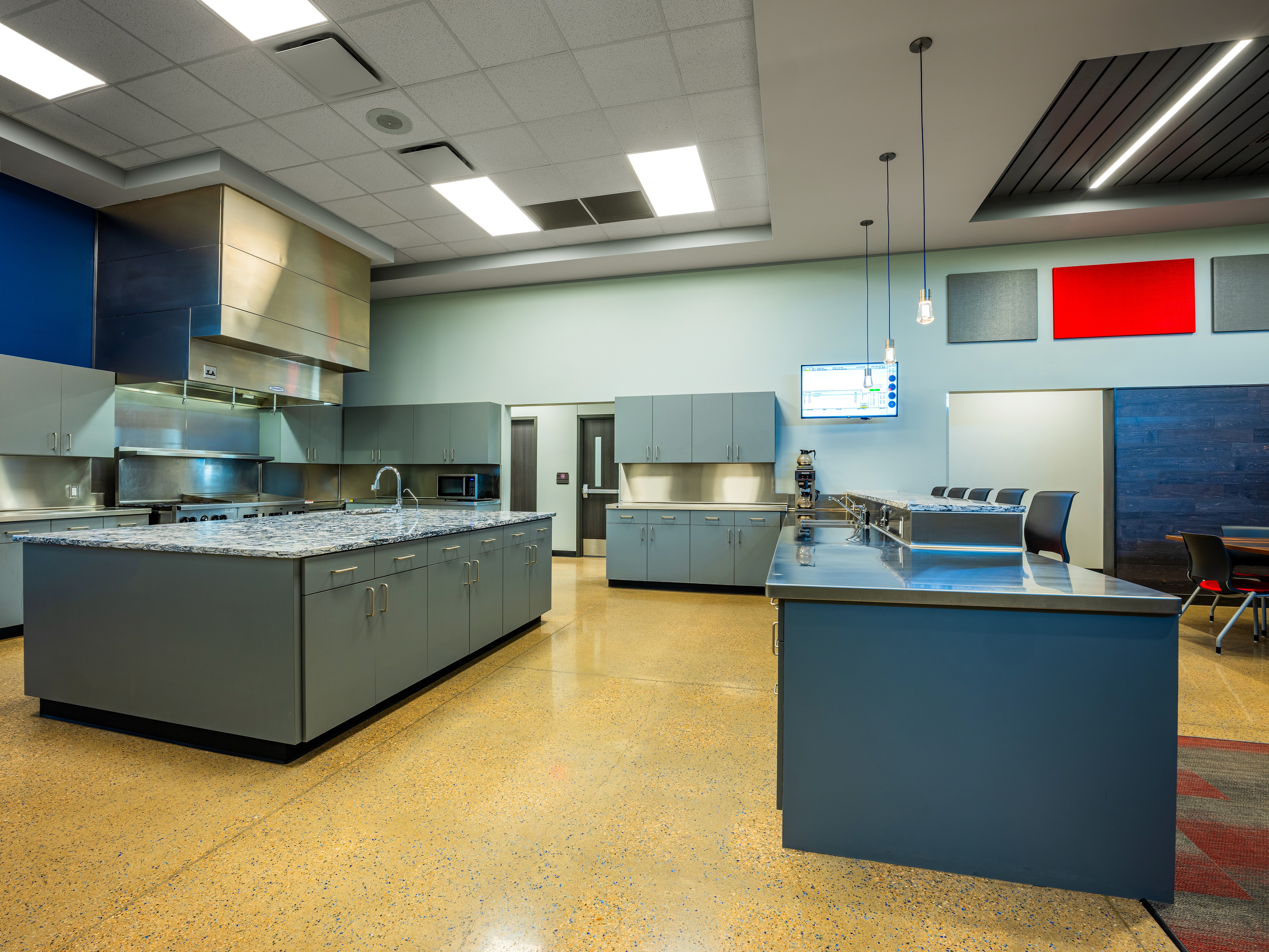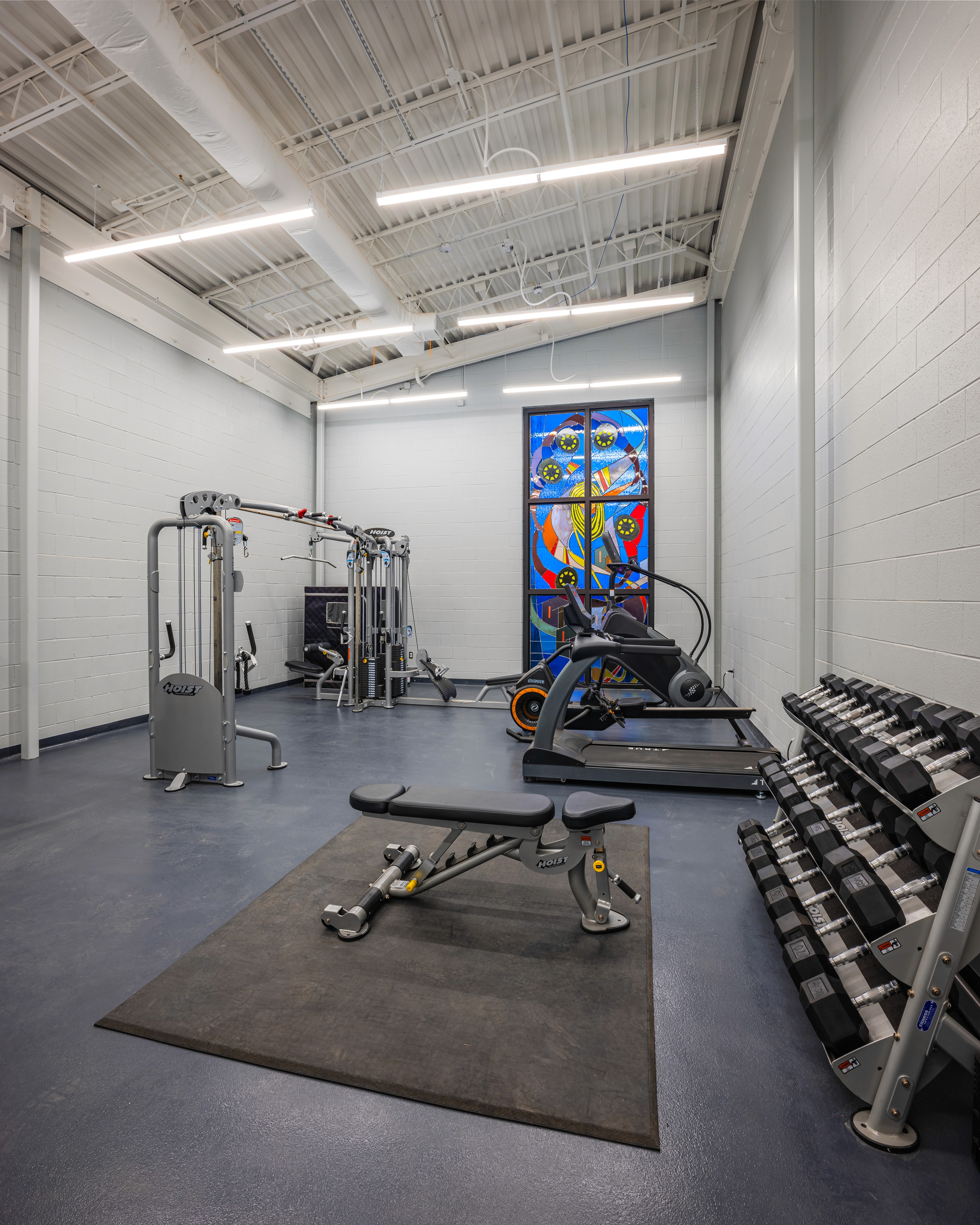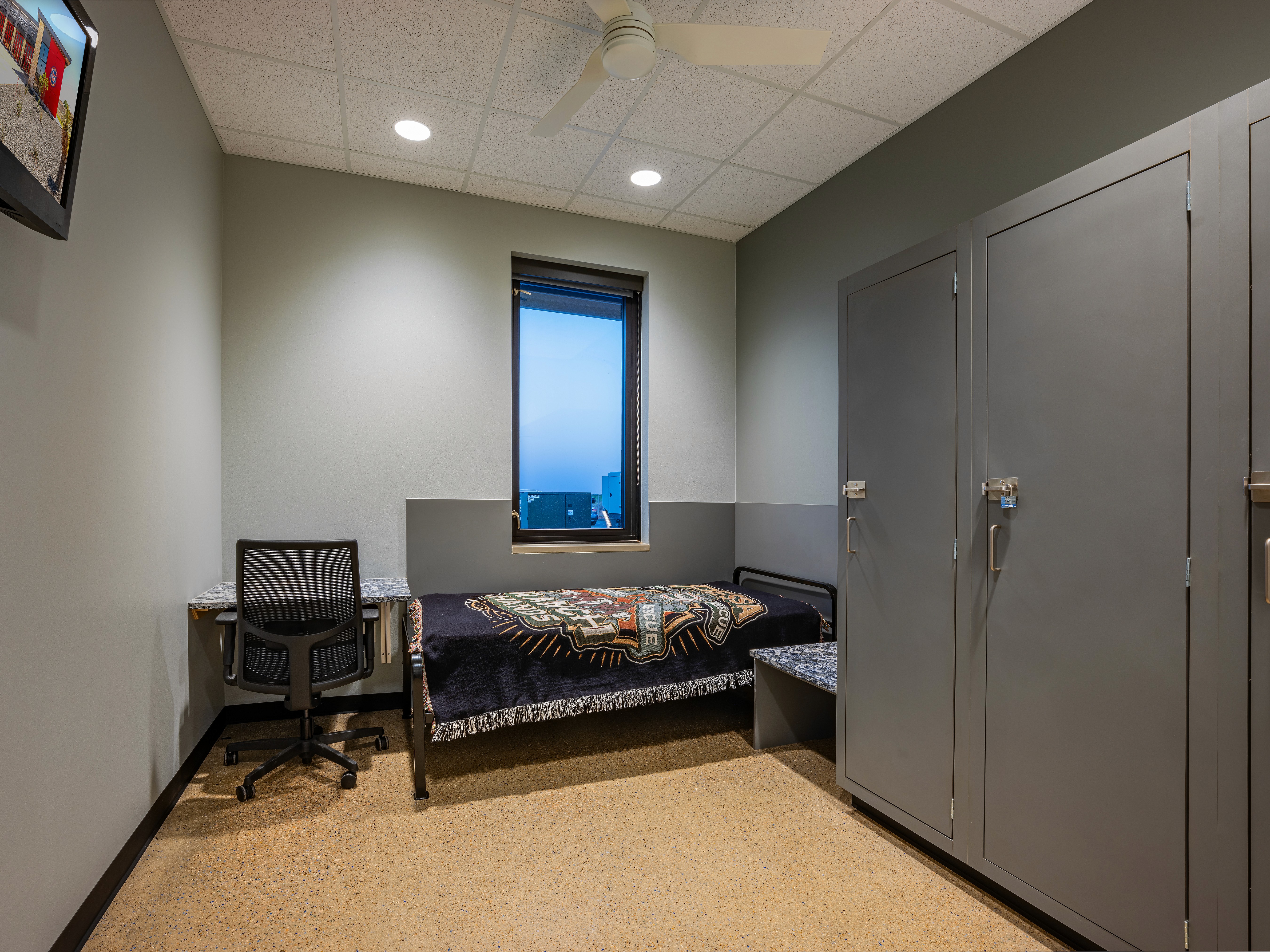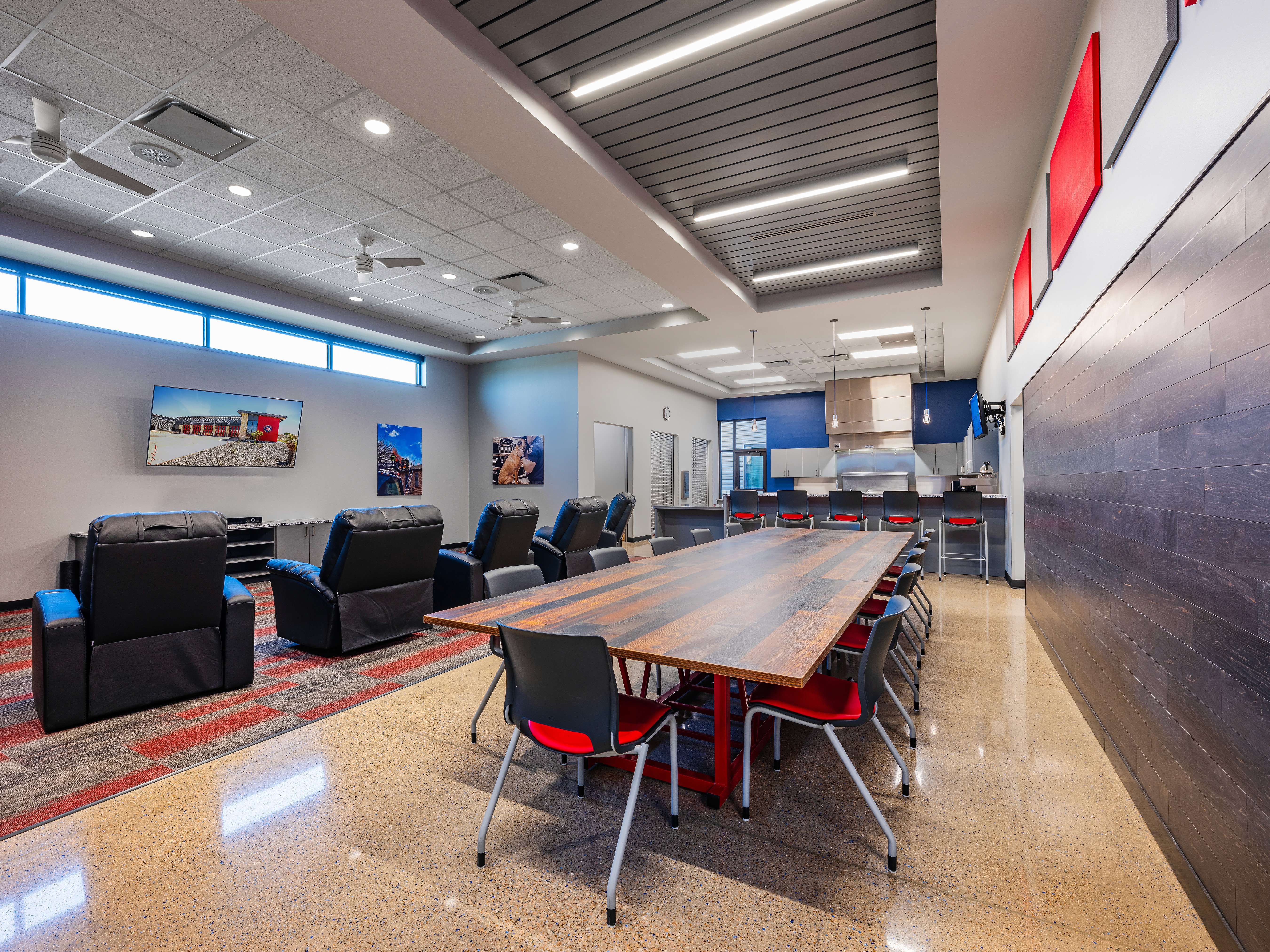 Station 9, designed alongside Station 6, features a unique interior while reflecting a strong exterior character with natural stone and metal panels. The design incorporates large windows at entry points to create a welcoming atmosphere. A focus on community pride is evident through stained glass applications from the city’s art program. The layout promotes efficient emergency response, with individual sleeping rooms and strategically placed gender-neutral restrooms. Common areas, including the day room and kitchen, utilize an open-concept design with vibrant finishes. A mezzanine space houses a fitness room, isolated for noise control. The garage includes a state-of-the-art exhaust removal system to enhance safety. Overall, Station 9 emphasizes functionality, community engagement, and a modern design aesthetic.
