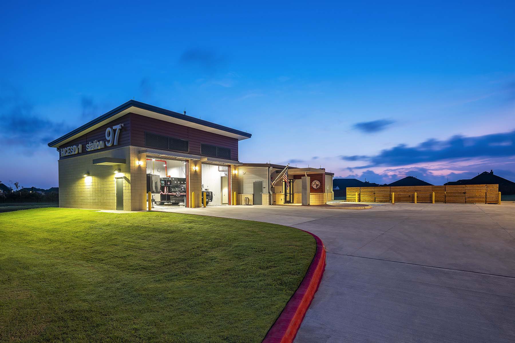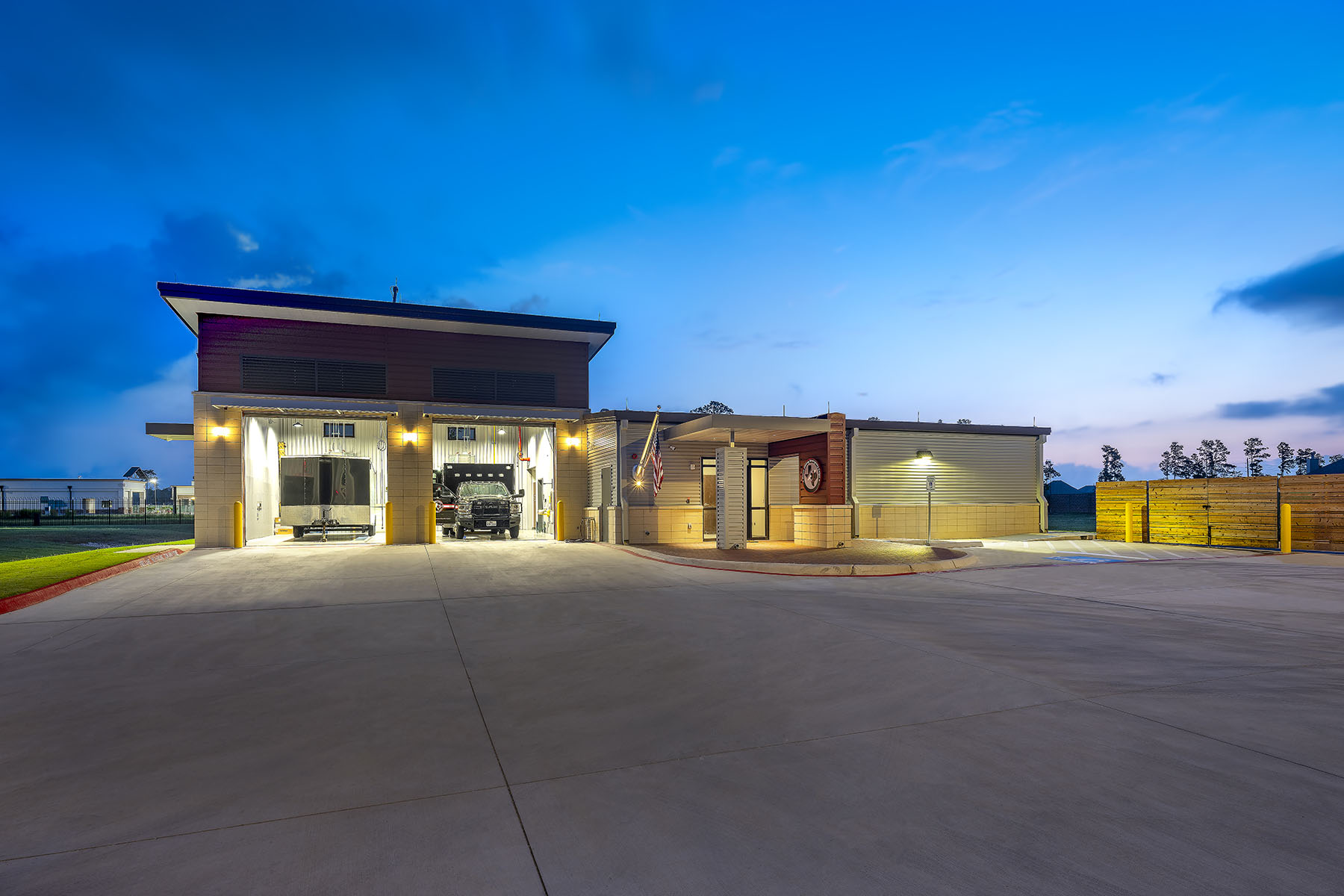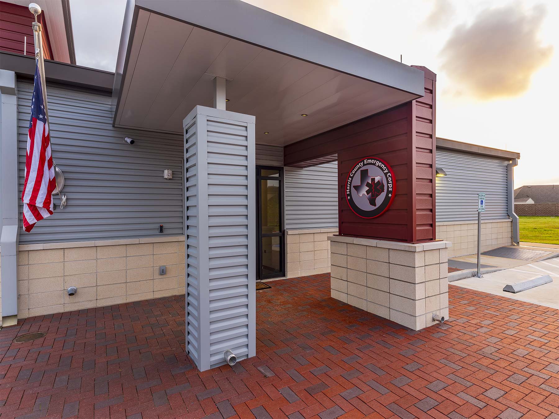 Harris County Emergency Corps (HCEC) EMS Station 97 is designed to provide efficient emergency medical services, strategically located behind a fire station. The facility features a single-slope shed roof and a pre-engineered metal building, focusing on functionality rather than aesthetics. The ambulance bays slope southward to enhance visibility from the road, while the living areas slope northward to optimize natural light without heat gain. The interior layout promotes comfort and efficiency, with an open kitchen, dining area, and private sleeping rooms to minimize noise disruption. Gender-neutral restrooms facilitate quick access for emergency response. The building’s entrance is accentuated by brick pavers and a simple canopy, enhancing accessibility and weather protection.
