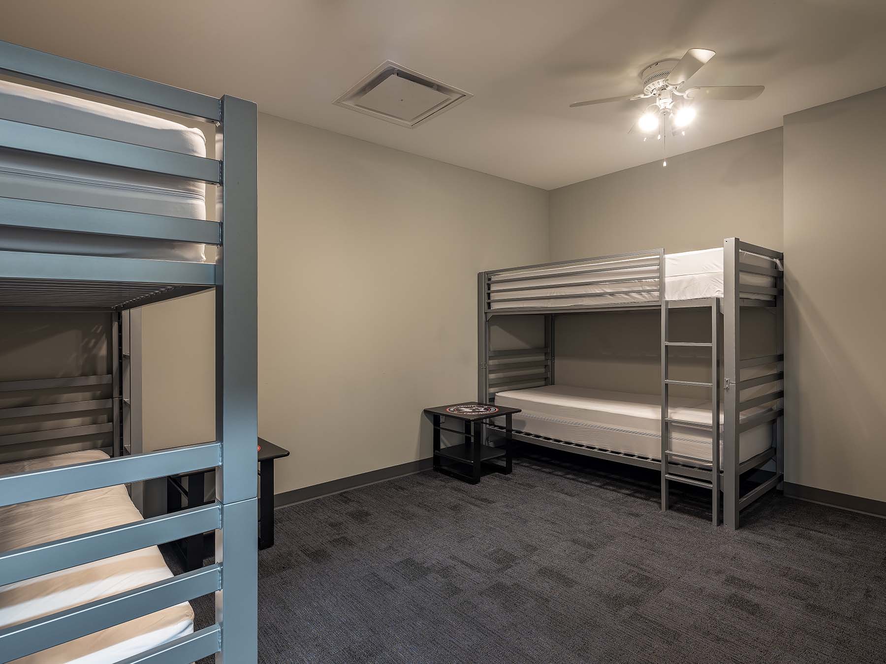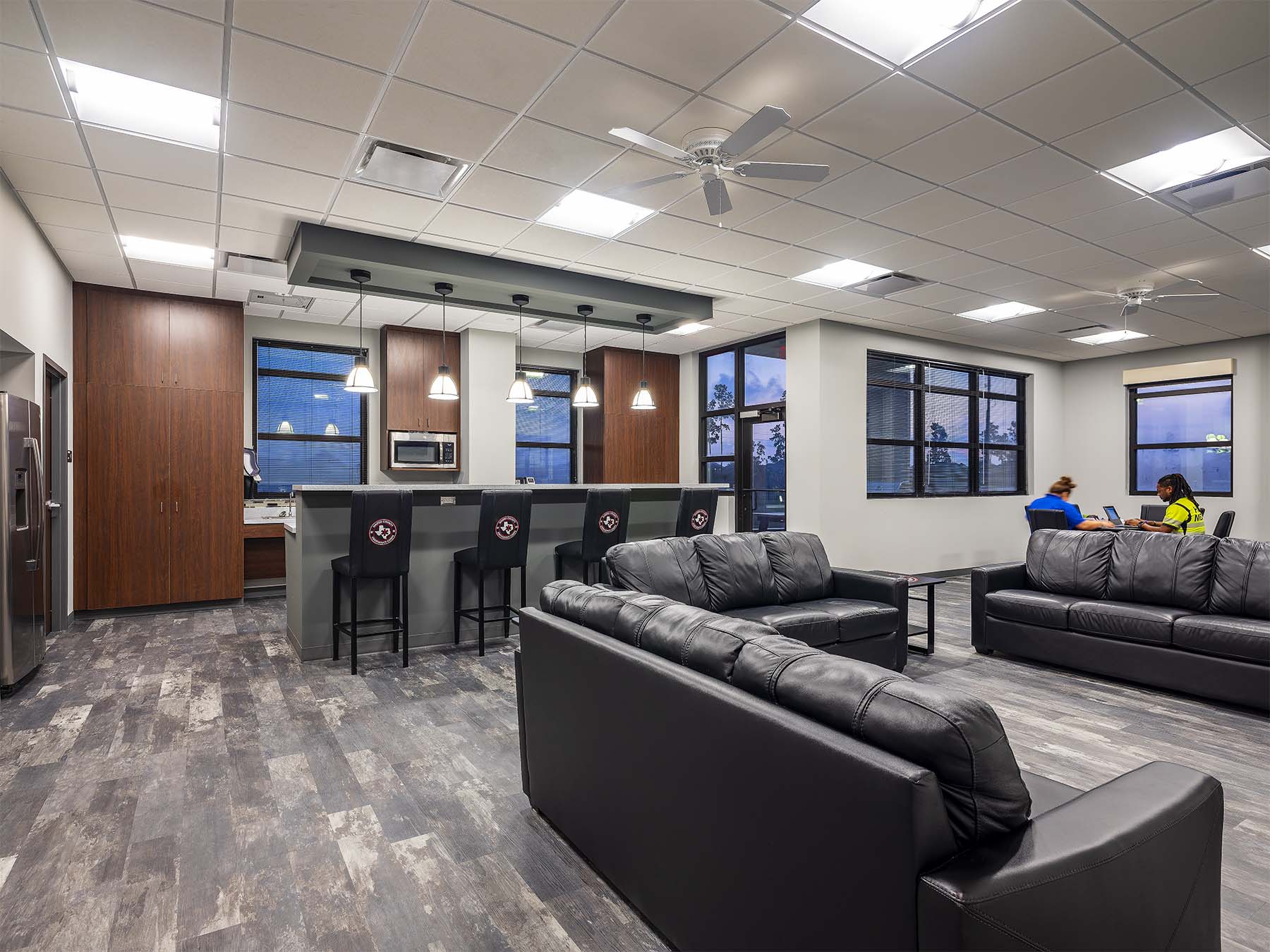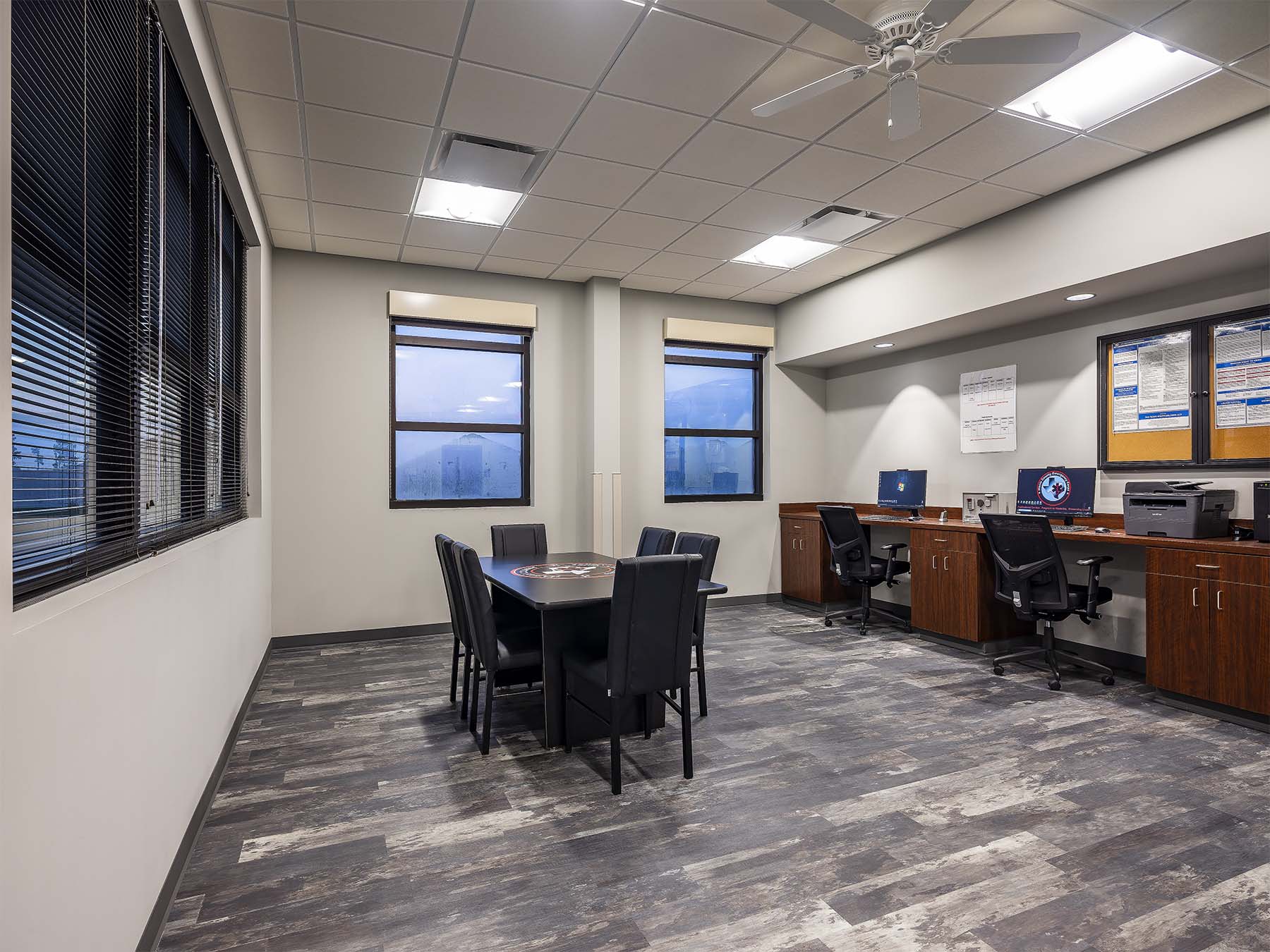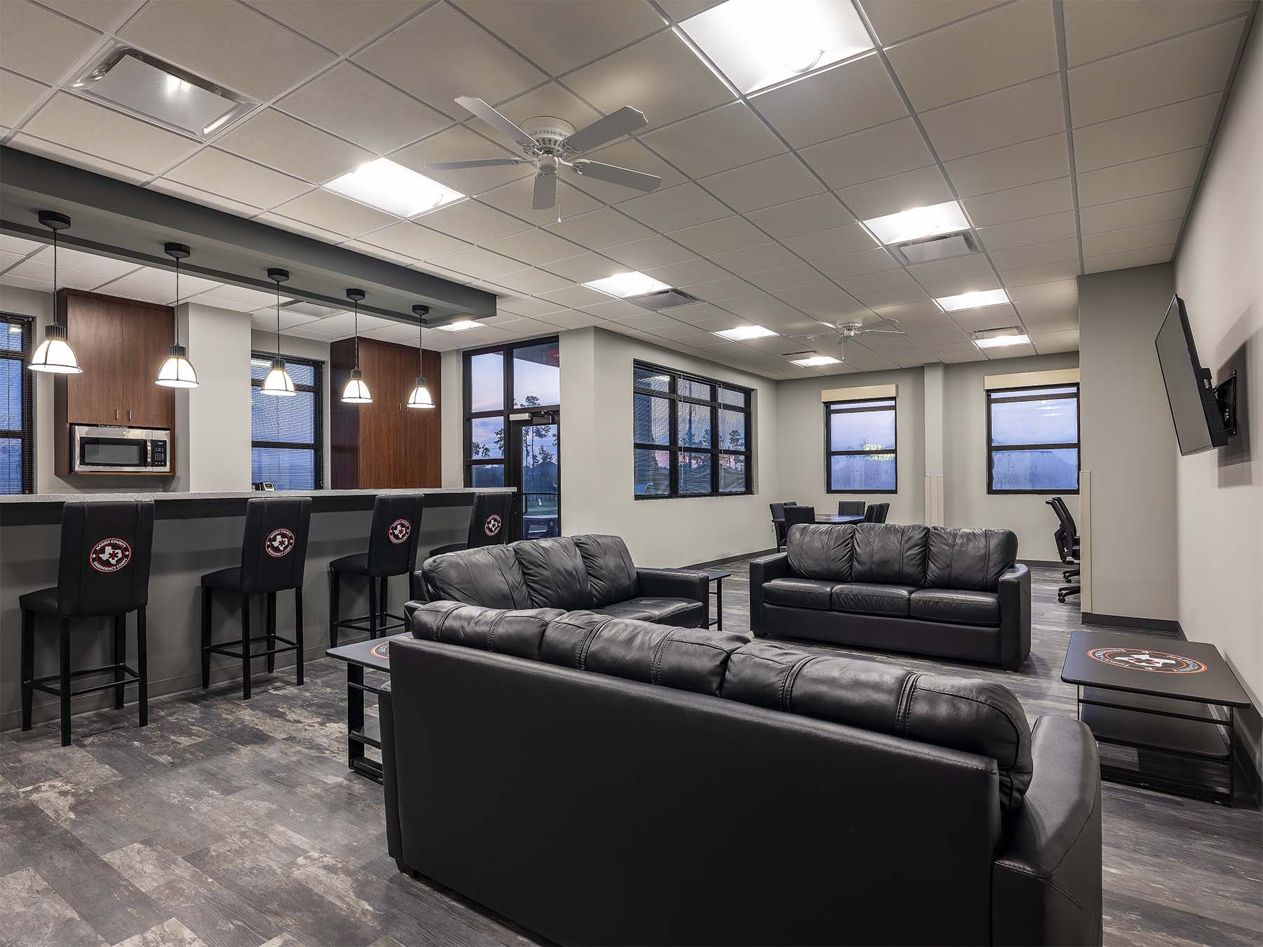 Harris County Emergency Corps (HCEC) EMS Station 97 is designed to provide efficient emergency medical services, strategically located behind a fire station. The facility features a single-slope shed roof and a pre-engineered metal building, focusing on functionality rather than aesthetics. The ambulance bays slope southward to enhance visibility from the road, while the living areas slope northward to optimize natural light without heat gain. The interior layout promotes comfort and efficiency, with an open kitchen, dining area, and private sleeping rooms to minimize noise disruption. Gender-neutral restrooms facilitate quick access for emergency response. The building’s entrance is accentuated by brick pavers and a simple canopy, enhancing accessibility and weather protection.