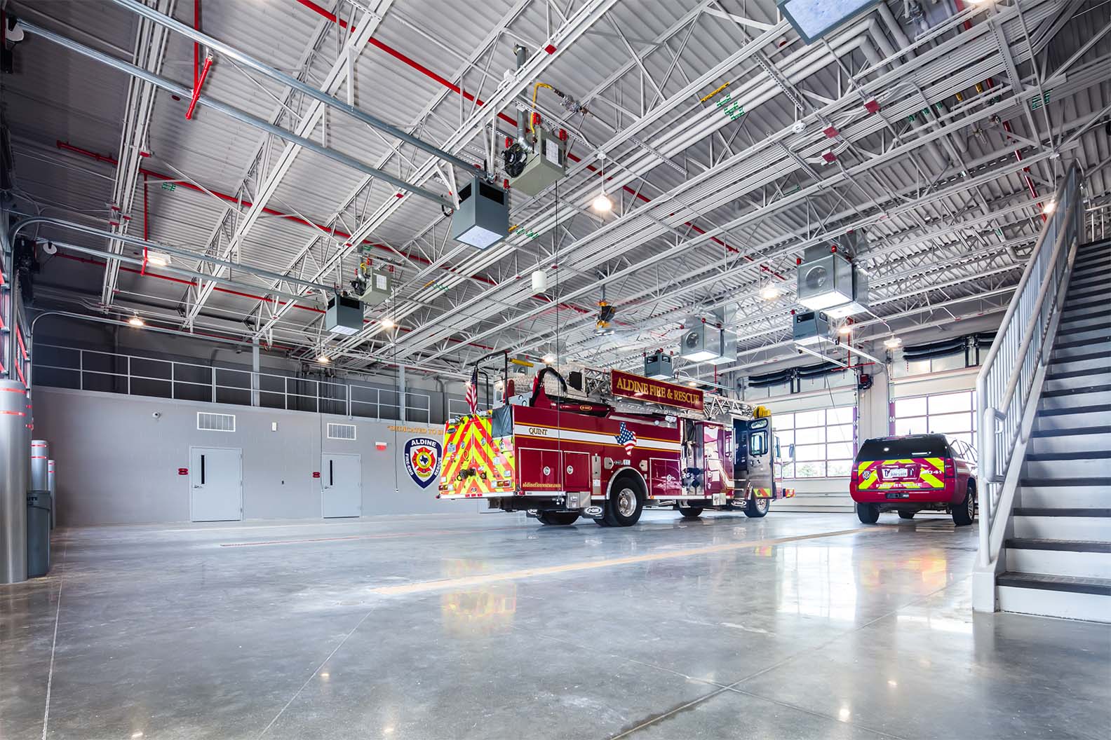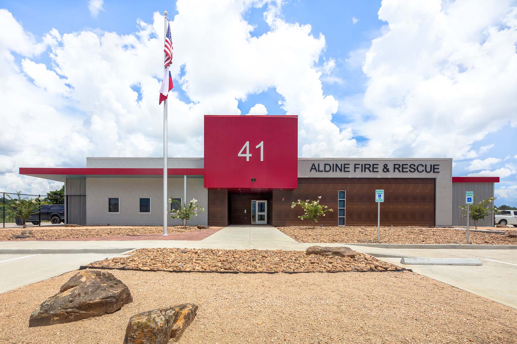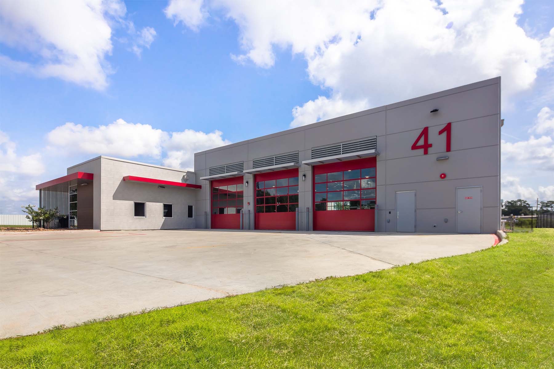 Harris County ESD 24's Fire Station 41 in Houston features innovative pre-cast concrete tilt-wall construction, providing a durable exterior while enhancing cost efficiency. The design includes a striking floating red box that serves as a prominent community landmark. The layout emphasizes functionality with access-controlled entries, an open-concept day room, and strategically designed sleeping accommodations that facilitate quick access to restrooms. The station incorporates modern amenities, such as an automated exhaust removal system and a communal kitchen that fosters community interaction. Additionally, the low-maintenance landscaping complements the station's contemporary aesthetic, making it a vital resource for the Houston community.